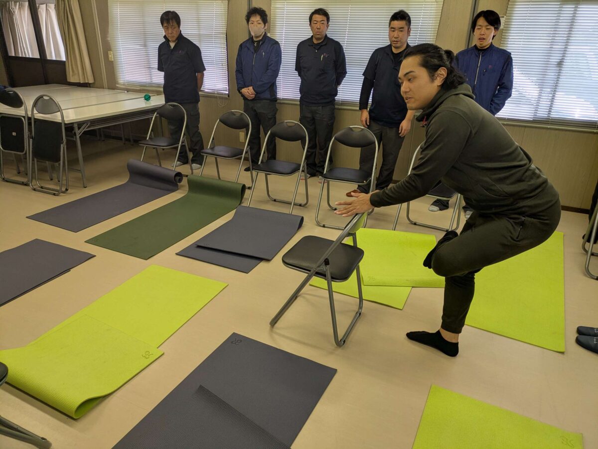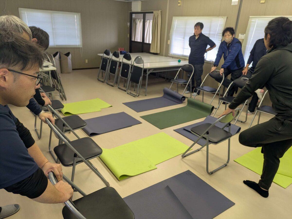 七栄では、本社、各営業所、デイサービスで月に1回健康講座が行われています。本日は10月に行われた岩手営業所の健康講座をご紹介します。運動療法士の先生が考えたメニューで1時間ほど体をほぐしたり、無理のない程度で筋肉を動かしたり、難しい動きはありませんが、講座終了後はとても体が軽くなります。