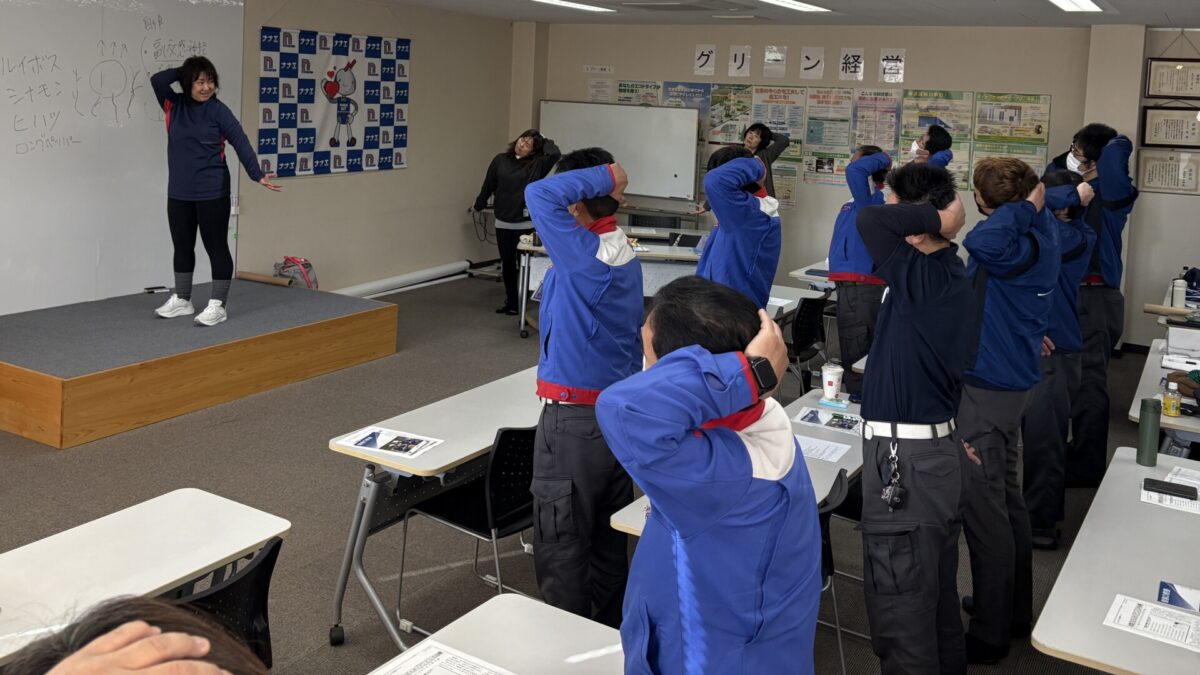 2月28日に本社で健康講座が行われました。今月は、神経トレーニングで肩まわりを強化しました。