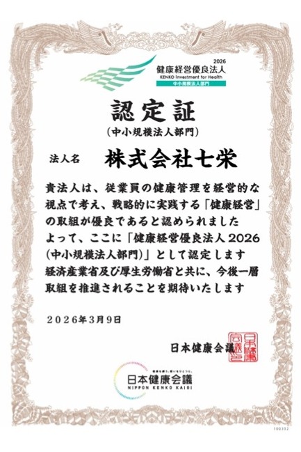 株式会社 七栄では、2026年も健康経営優良法人の認定をいただきました。認定には、健康に対しての意識や、日々の取り組みが大切です。弊社では、社員が1日1回健康体操を行ったり、運動療法士の先生に休憩時間にできる体操をレクチャーしていただき実践したりと、自分のできる範囲で取り組みをしています。健康であるために、コツコツと取り組む七栄社員です。