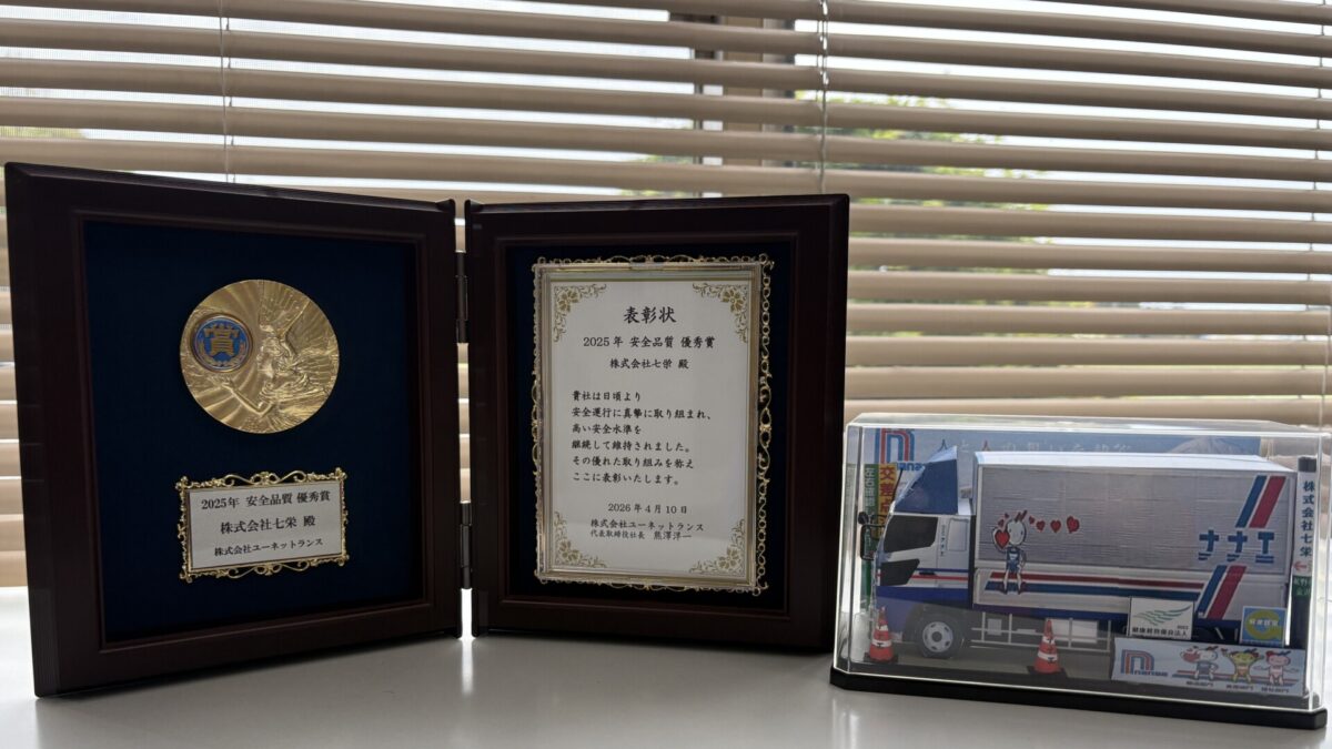 2026年4月10日に株式会社ユーネットランス様より、『2025年 安全品質 優秀賞』をいただきました。日頃より安全運行を心掛けている乗務員が評価、表彰されたことは、大変喜ばしいことです。これからも、高い安全水準でお客様の製品をお届けします。